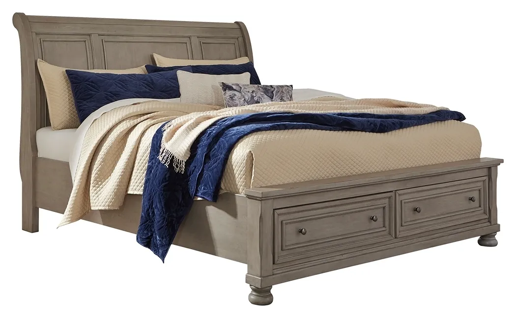 King Sleigh Bed with Storage: Satisfying your taste for tradition, this king sleigh bed with storage sports serene sophistication. Forever classic design details-inlaid panels, silvertone patina hardware and bun feet-are so easy to love. Burnished light gray finish elevates the look with modern sensibility. Two roomy drawers keep your essentials organized in style. Made of veneers, wood and engineered wood, Includes headboard, footboard with storage, slats and rails. Silvertone patina hardware, 2 smooth-gliding drawers with dovetail construction. Mattress available, sold separately, Included slats eliminate need for foundation/box spring.