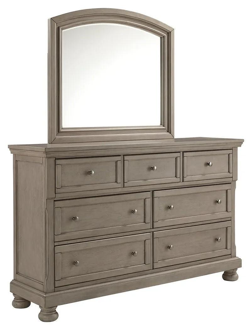 Dresser & Mirror: This dresser and mirror set sports serene sophistication. Forever classic design details-inlaid panels, silvertone patina hardware and bun feet-are so easy to love. Seven roomy drawers keep your wardrobe organized in style. Beveled mirror frame beautifully echoes the dresser's burnished light gray finish for modern sensibility. Made of veneers, wood and engineered wood, Silvertone patina hardware, 7 smooth-gliding drawers with dovetail construction, Top drawers felt-lined, 1 felt-lined jewelry tray, Mirror attaches to back of dresser.