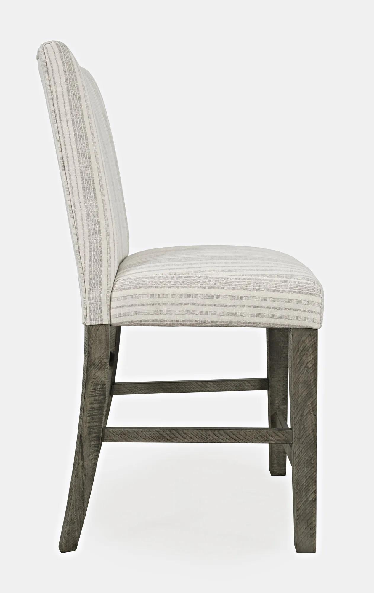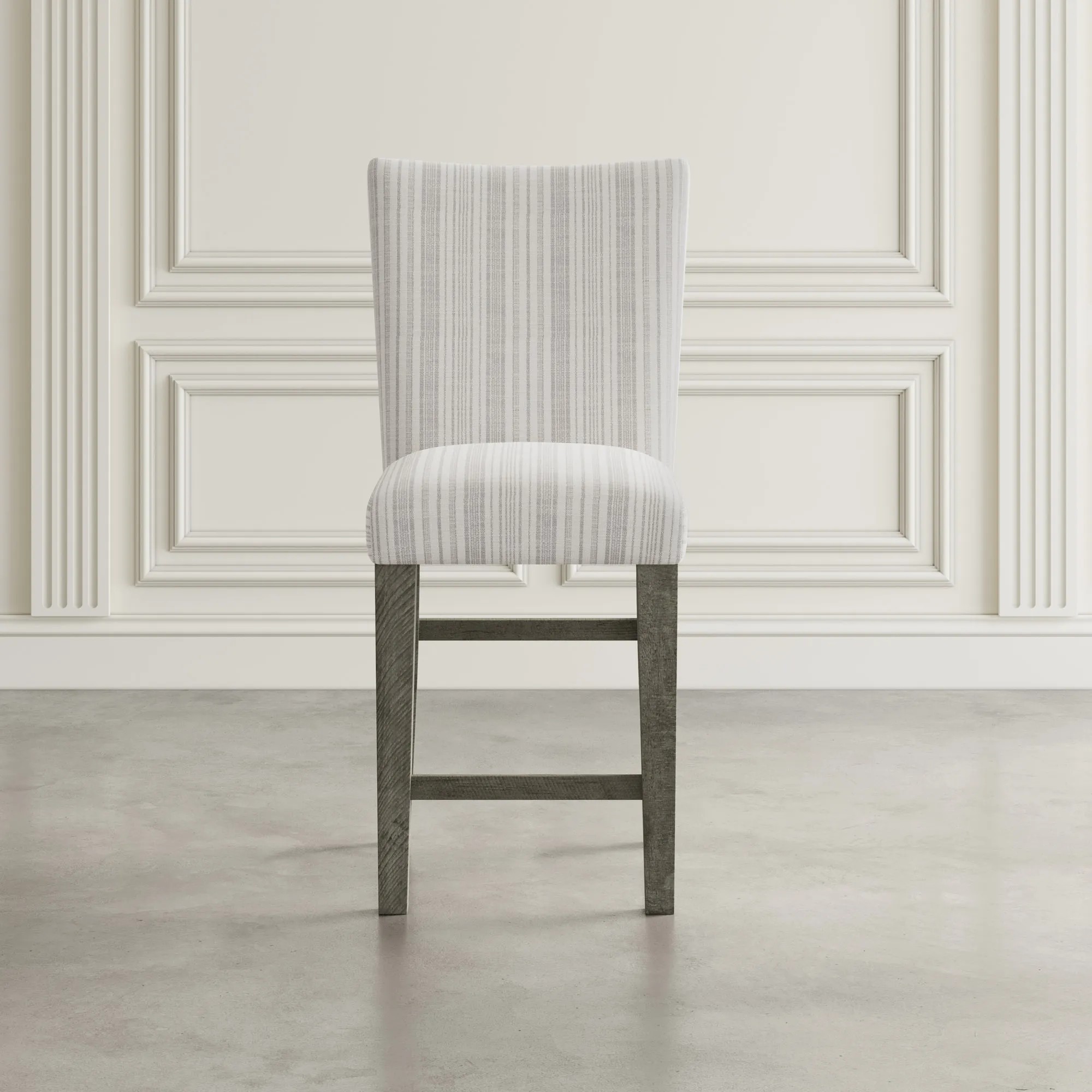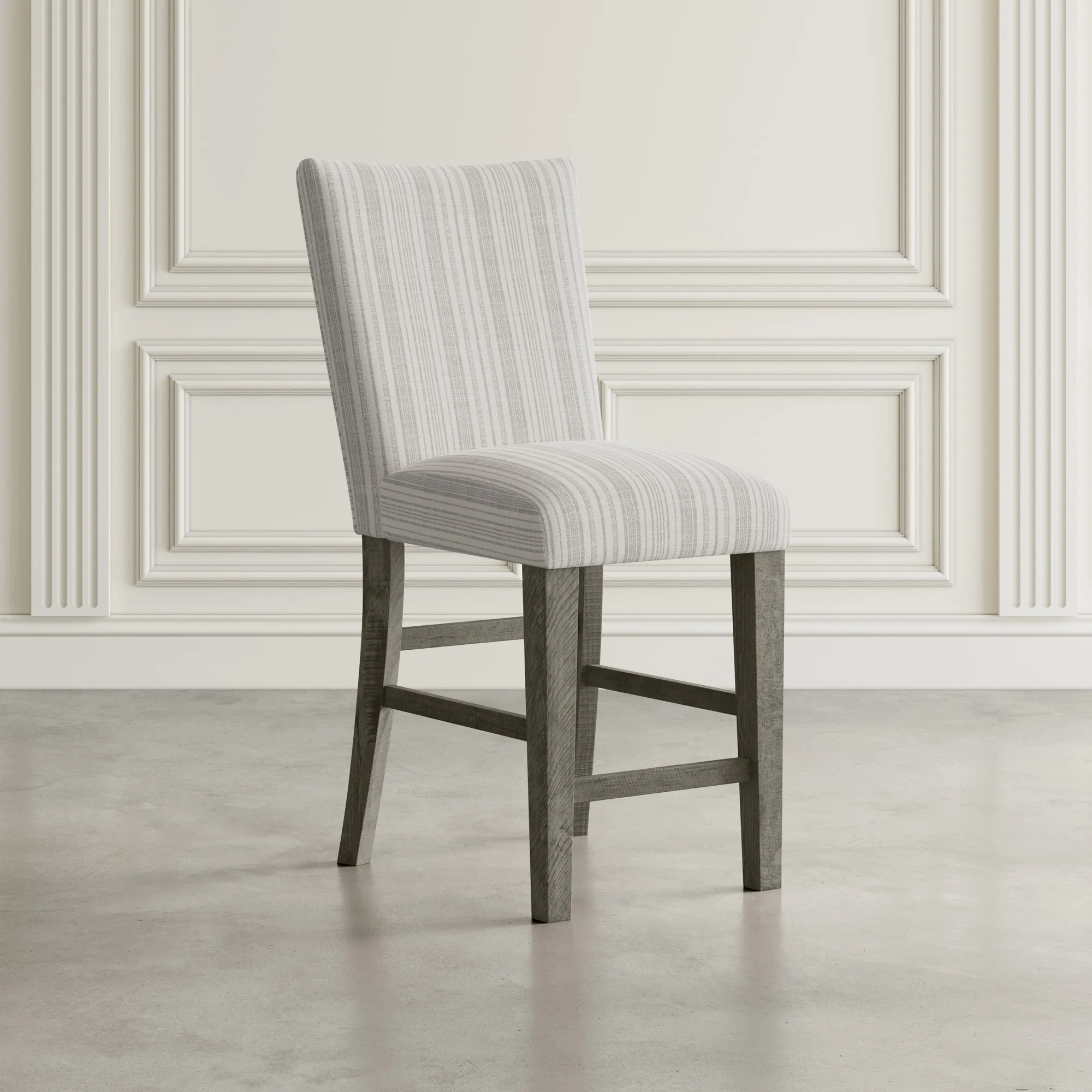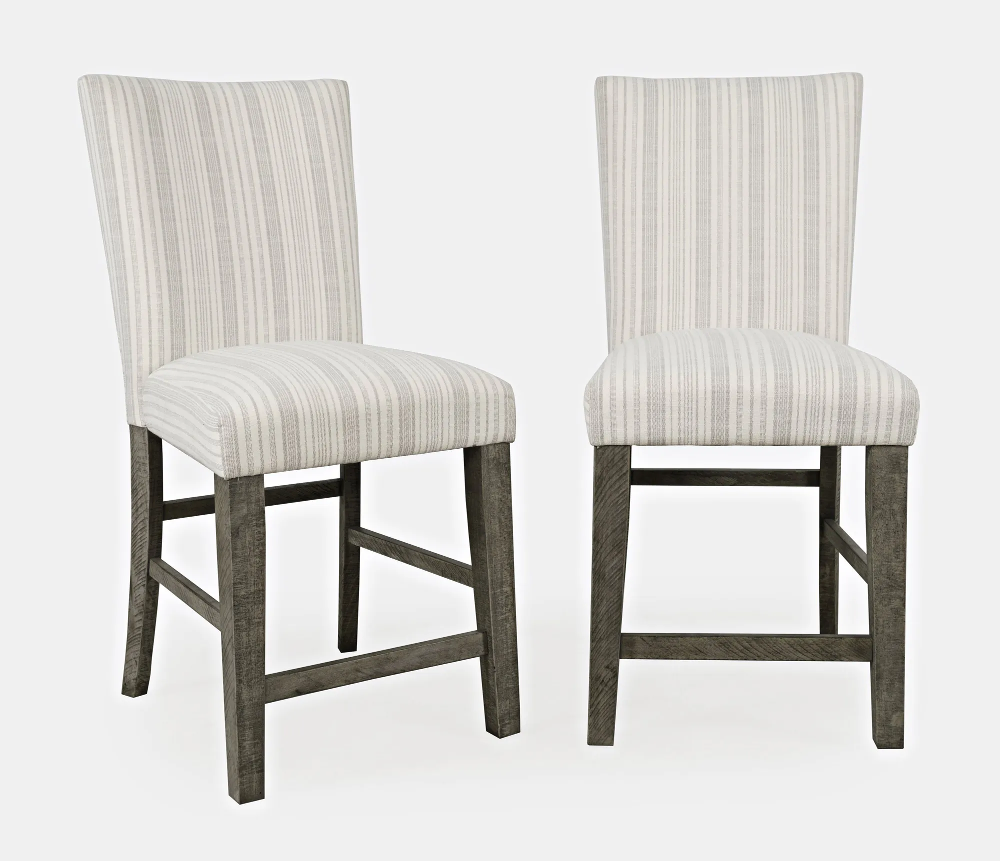 - -Set of Two Counter Height Barstools -Solid Distressed Pine - Contemporary Rustic Farmhouse Style -Soft Upholstered Seat and Back with Grey Striped Fabric -Parsons Style Design -Built-In Footrest -Blue Stripe Fabric Upholstery -