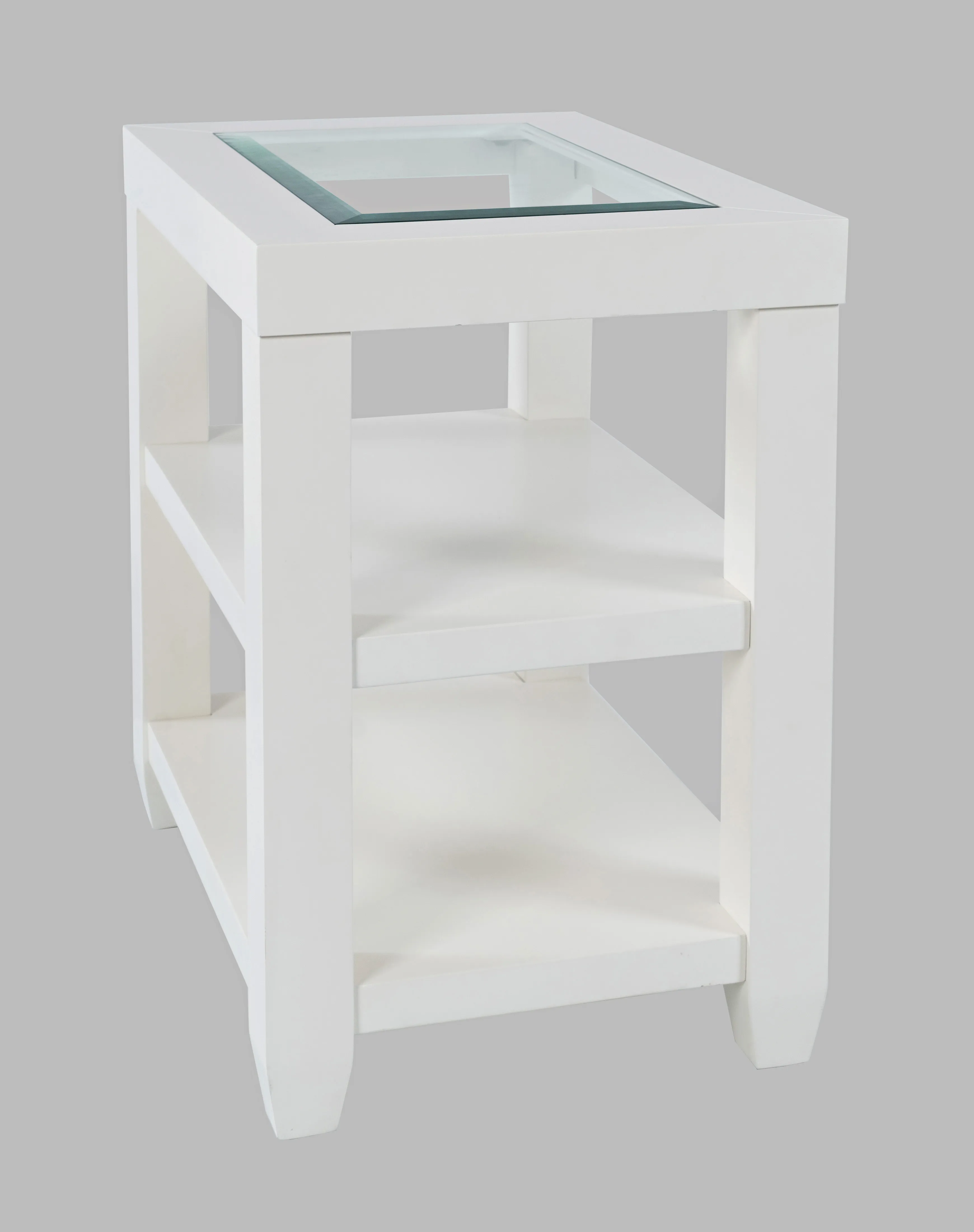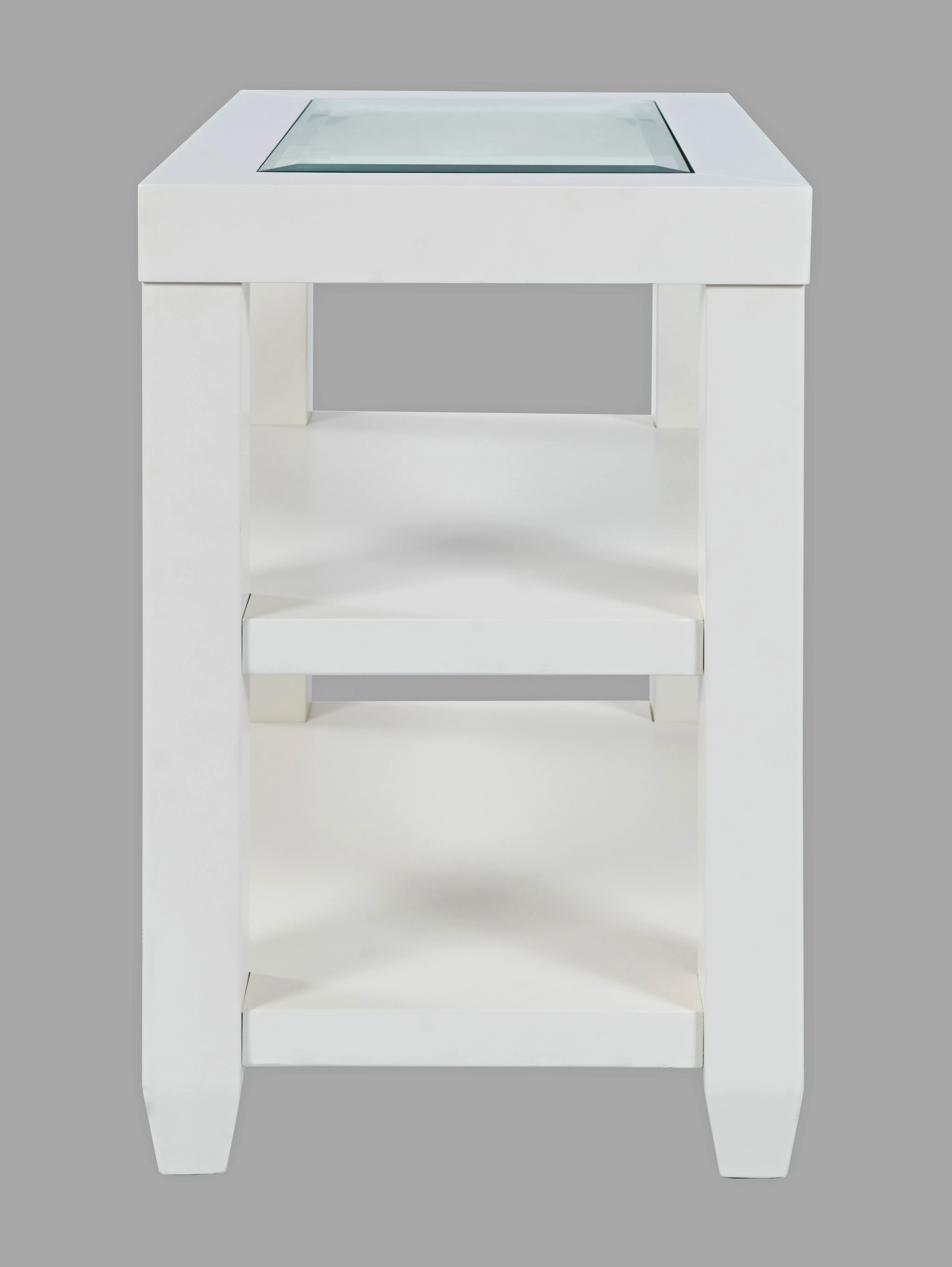 Contemporary style with a solid tempered glass inlay, this Urban Icon Chairside Table features three unique color options and modern beveled edges in a compact design. Two full-length storage shelves are included, and the modern style matches a wide range of home decor. Available In White, Black, and Merlot finishes.