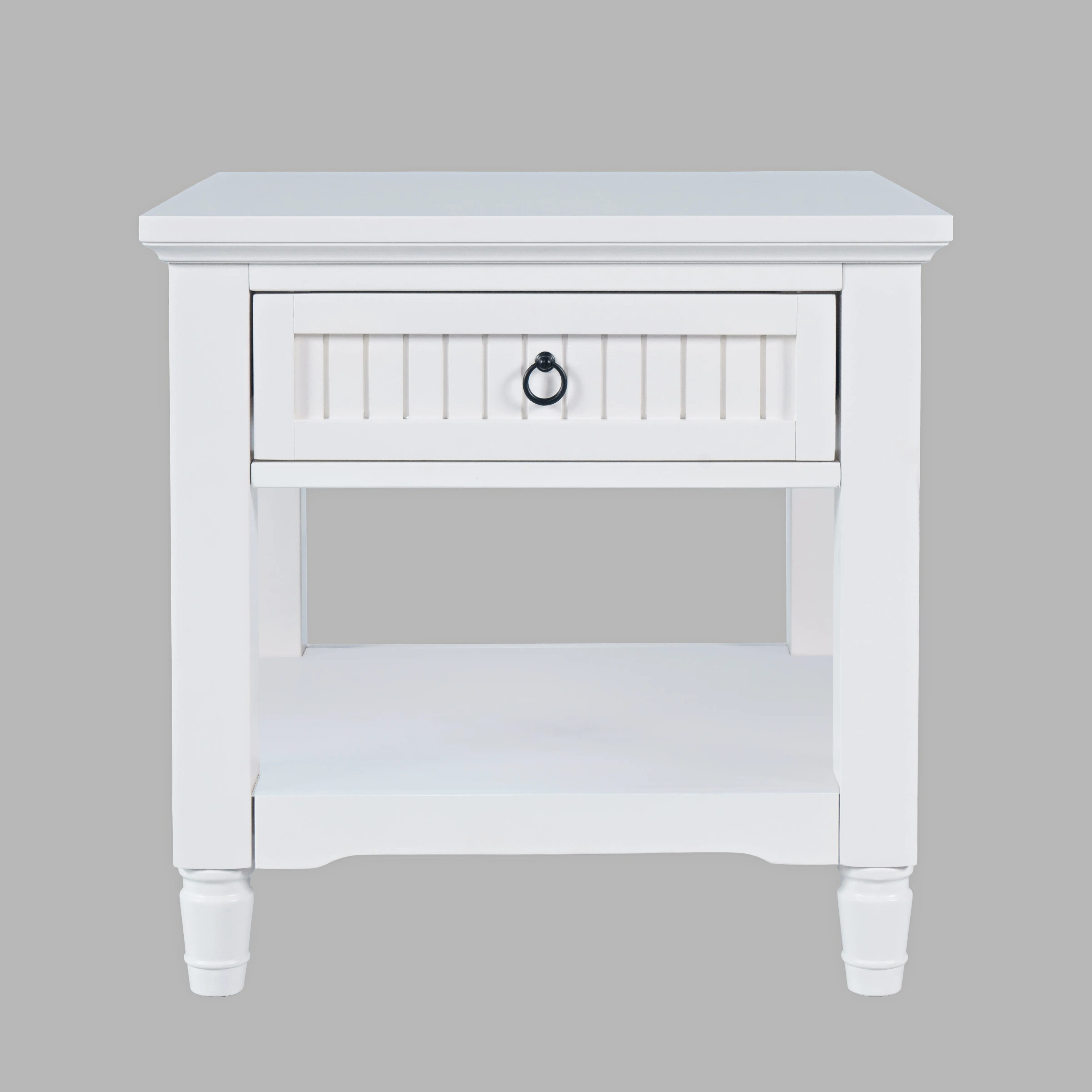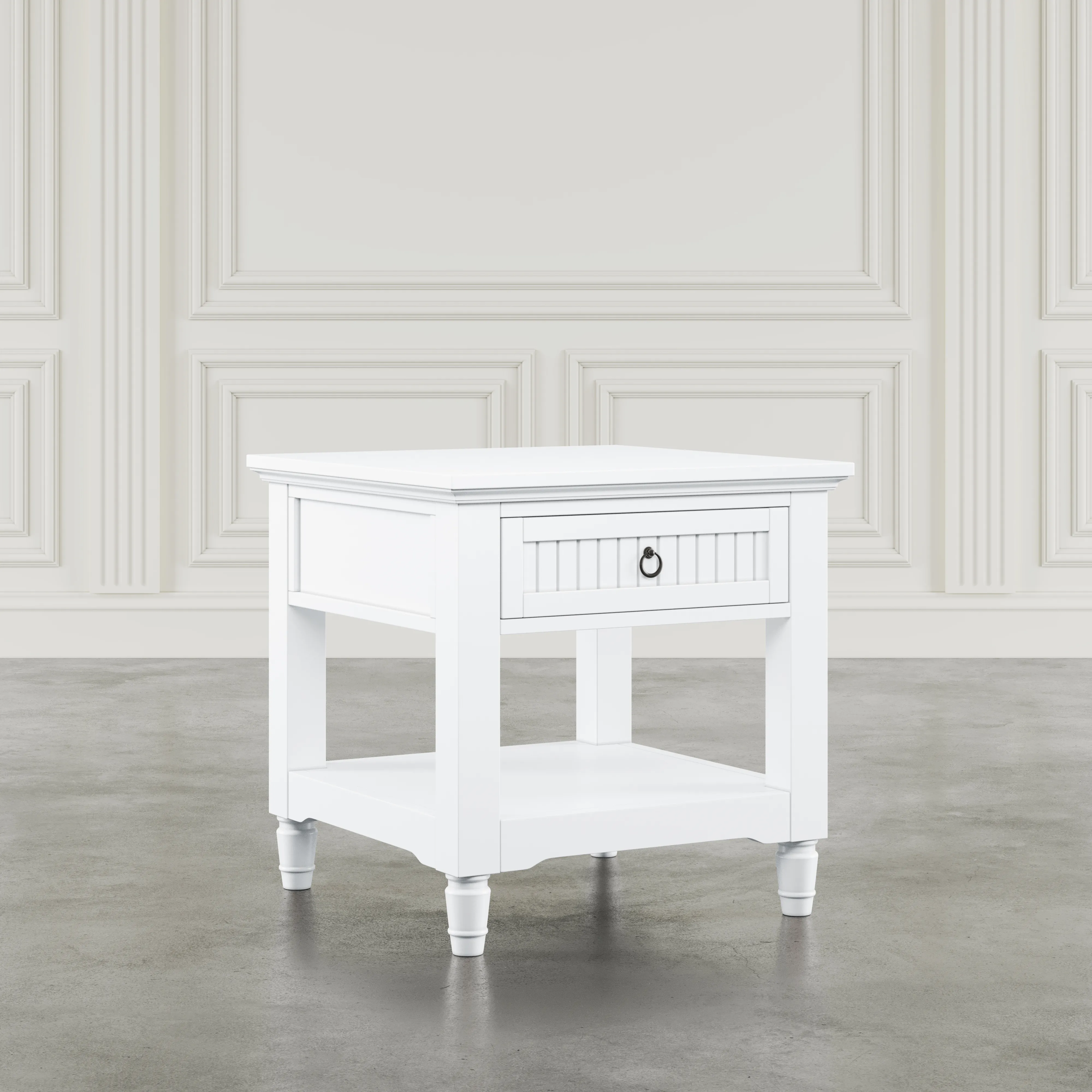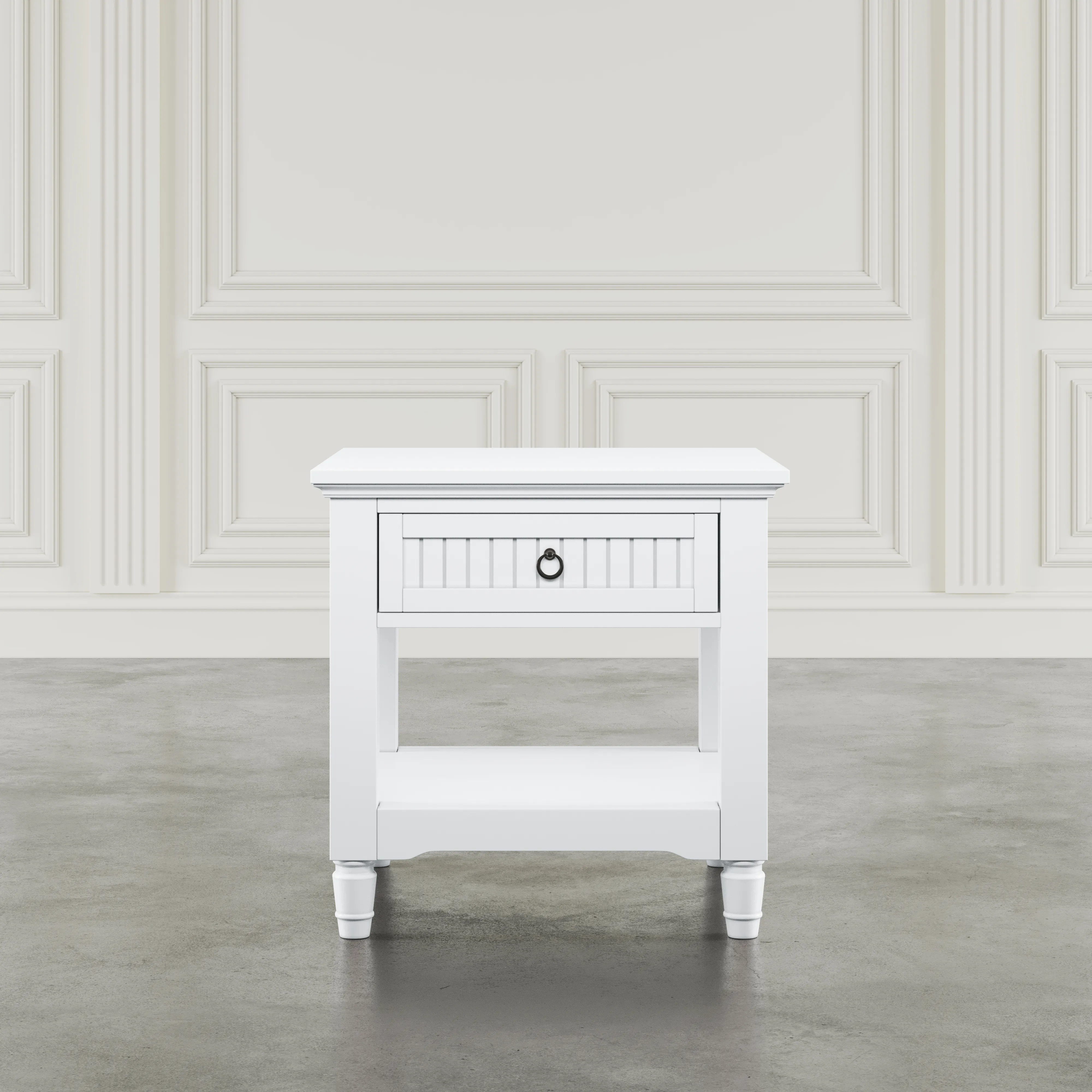 The Westport Chairside Table brings timeless charm and everyday function to your living room or bedroom. Thoughtfully designed with coastal, cottage, and modern farmhouse style cues, this versatile piece works beautifully next to a sofa, recliner, or bed. Crafted from acacia and veneer, the table highlights beadboard-style paneling on the drawer front and a clean painted finish that feels light and inviting. A spacious open shelf provides the perfect spot for displaying books, baskets, or decorative accents, while the top surface offers plenty of room for a lamp or framed photos. The single drawer keeps smaller essentials tidy and within reach, making it ideal for remote controls, chargers, or notepads. Turned legs and simple ring-pull hardware add a touch of classic character without overpowering the design. Compact in footprint yet generous in utility, this chairside table is a natural fit for casual interiors that embrace relaxed elegance. Whether styled in a coastal retreat or a modern farmhouse setting, it offers both beauty and practicality in equal measure.