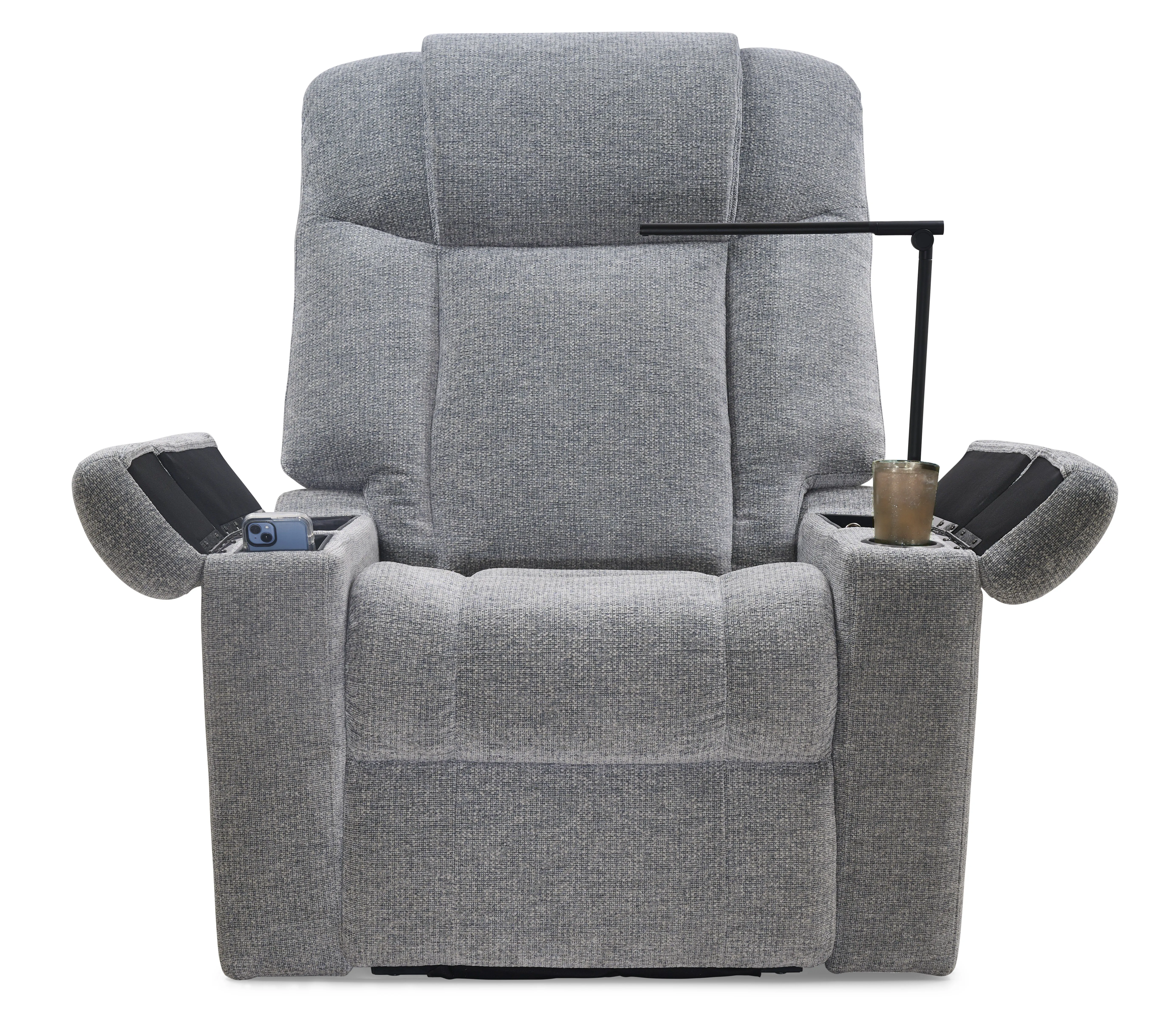 The Venice is designed for total relaxation. This chair features a generously padded seam back, plush chaise pad, and a sleek open-arm design that includes a built-in cup holder, hidden storage, a power port with a removeable reading light and tray table, a wireless phone charger, and a USB port – all within arm’s reach