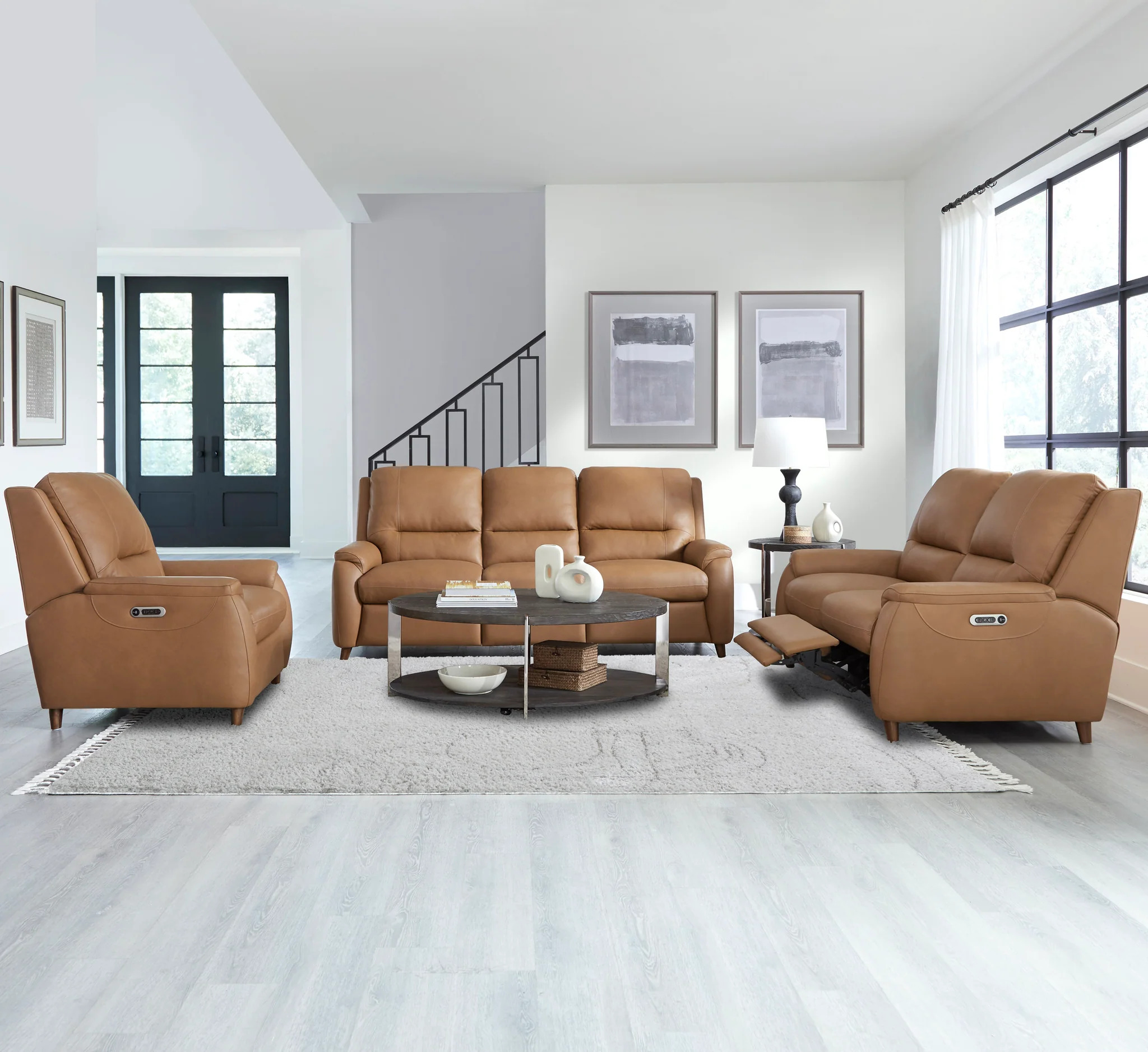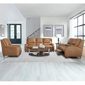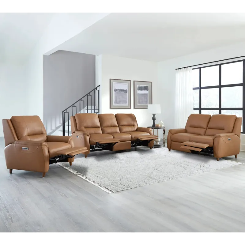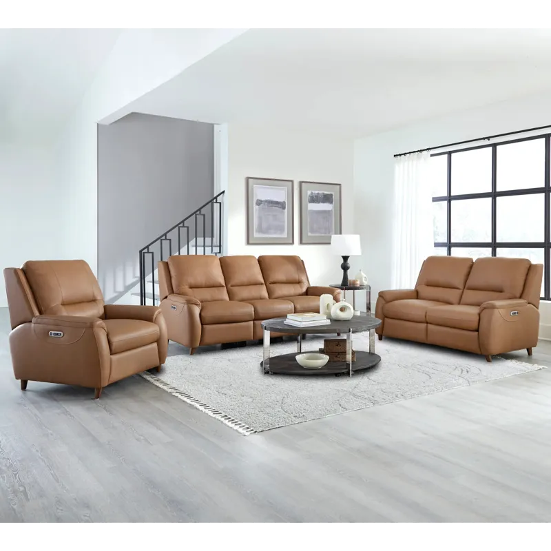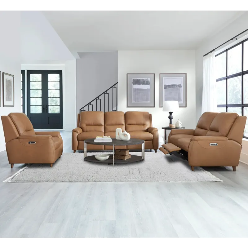 The Austin power recliner is designed for ultimate comfort and convenience. It features independently operating power headrests and is upholstered in supple leather with a custom match. The modern high-leg design in a warm walnut finish gives it a contemporary look. The power recline switch includes USB and USB-C ports, as well as a "home" button to bring all positions back to an upright position. It is also ready to mount any FreeMotionĀ® bracket and battery for cordless operation easily.